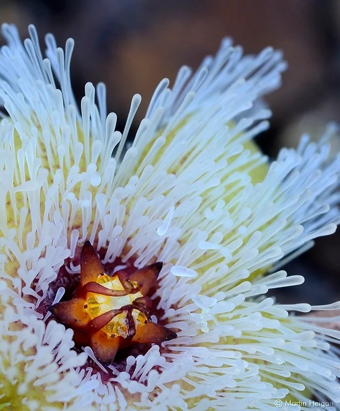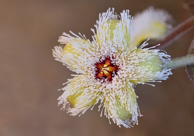 🌼 Éclatantes fleurs stellaires : Les fleurs en forme d'étoile, d'un diamètre allant jusqu'à 3,5 cm, apparaissent à l'automne à la base des jeunes tiges. Leur corolle est d'un vert jaunâtre clair, striée de rouge pâle, et est recouverte de poils blancs translucides, leur conférant une apparence magique.